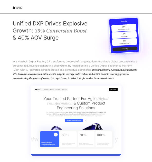 Digital Factory 24 transformed a non-profit organization's disjointed digital presence into a personalized, revenue-generating ecosystem. By implementing a unified Digital Experience Platform (DXP) with AI-powered…